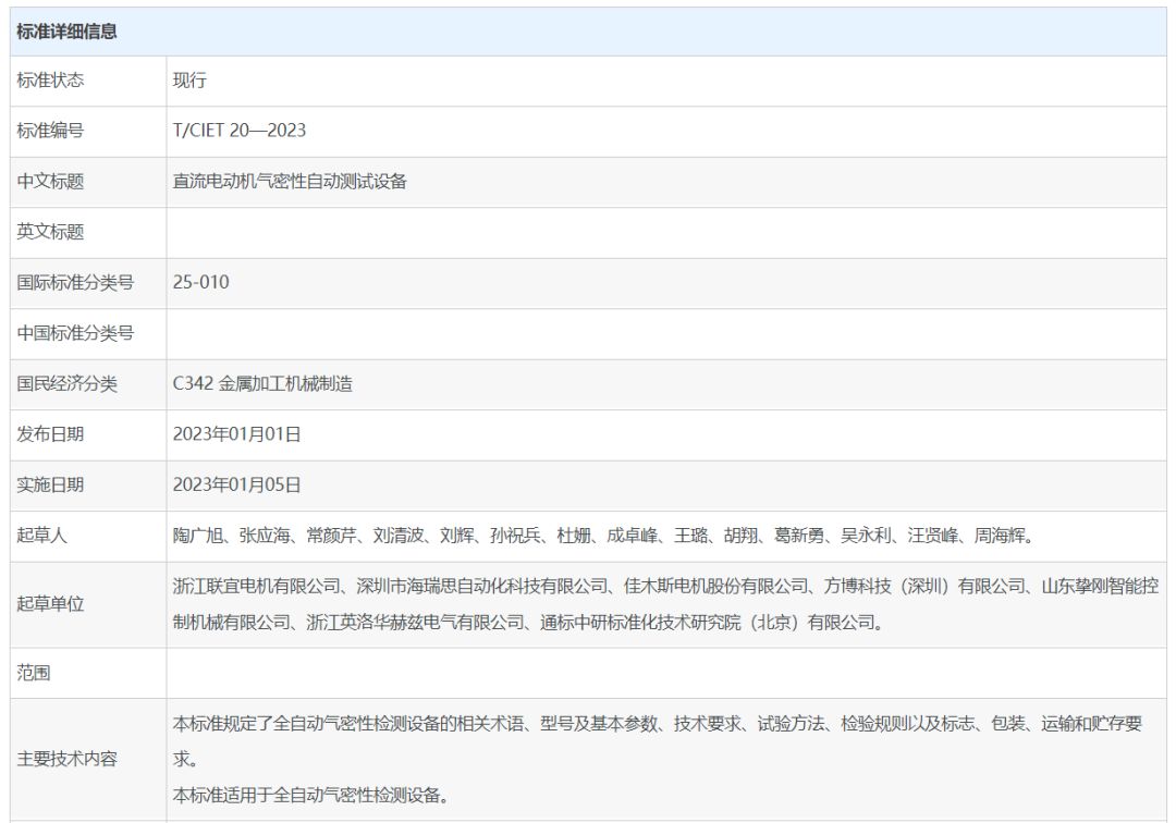 近日,由深圳市海瑞思自動化科技有限公司等其他6家相關(guān)企業(yè)和通標(biāo)中研標(biāo)準(zhǔn)化技術(shù)研究院(北京)有限公司共同制定的T/CIET 20—2023 《直流電動機(jī)氣密性自動測試設(shè)備》團(tuán)體標(biāo)準(zhǔn),經(jīng)中國國際經(jīng)濟(jì)技術(shù)合作促進(jìn)會審核通過正式發(fā)布。