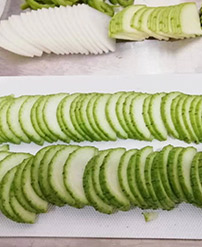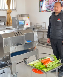 切菜機(jī)具備雙調(diào)頻功能,一端是切葉菜類,如長蔥,蒜苗,韭菜,芹菜,白菜,青菜等,一端是切球根莖類,如蘿卜,土豆,紅薯,芋頭,筍,洋蔥,茄子,蘋果,生姜等。根莖部分可切片(厚薄度2-10毫米可選),根莖部分切絲(2-10mm方絲可選),根莖部分切?。?mm,10mm,12mm,15mm,20mm),葉菜部分切段切條(長度1-90mm可調(diào)),具備雙調(diào)頻功能。