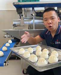 工作流程:供餡料斗->供面傳輸帶->包制->切斷成型->傳送帶->醒發->蒸制。