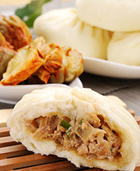 仿手工包子機采用仿手工搟面的方式將面皮壓成合適厚度。再由出餡部分將餡料填充至面皮上,經由卷面部分卷成圓柱形狀,傳送至成型部分成型,過程中不會破壞面皮筋性,保持手工原味。